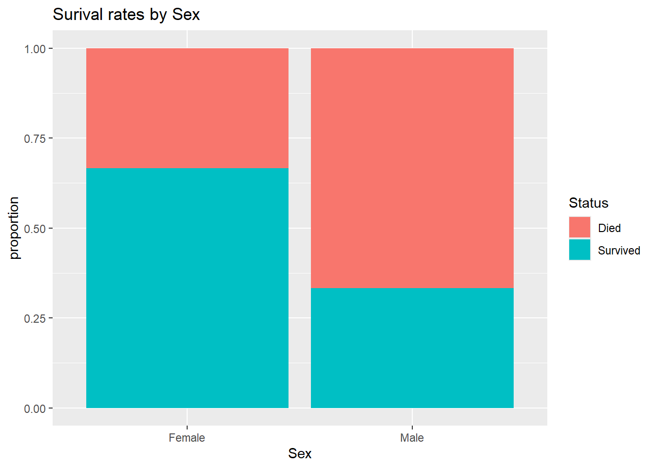 We can use the dplyr package’s group_by function to divide the data into the two Sex groups and compute the proportion who Survived within each group. Here we see that 2/3 of females survived while only 1/3 of males survived.