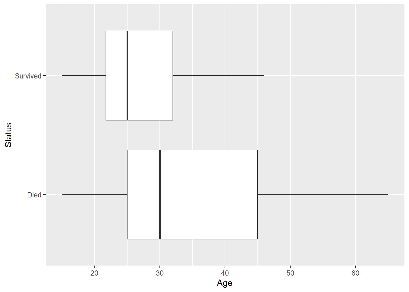 ## 2 Male 0.333A side-by-side boxplot shows that people who survived tended to be younger: