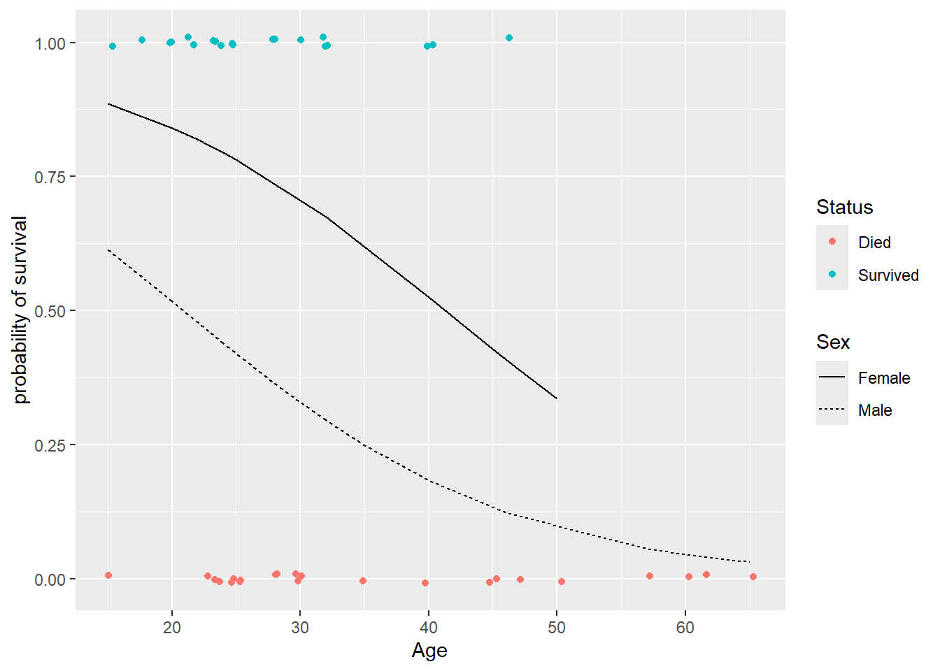 We can see that an age of about 30 yields an estimated survival probability of 50% while an age of about 45 yields an estimated survival probability of 25%. We can better quantify these values by fitting the model using the glm function.