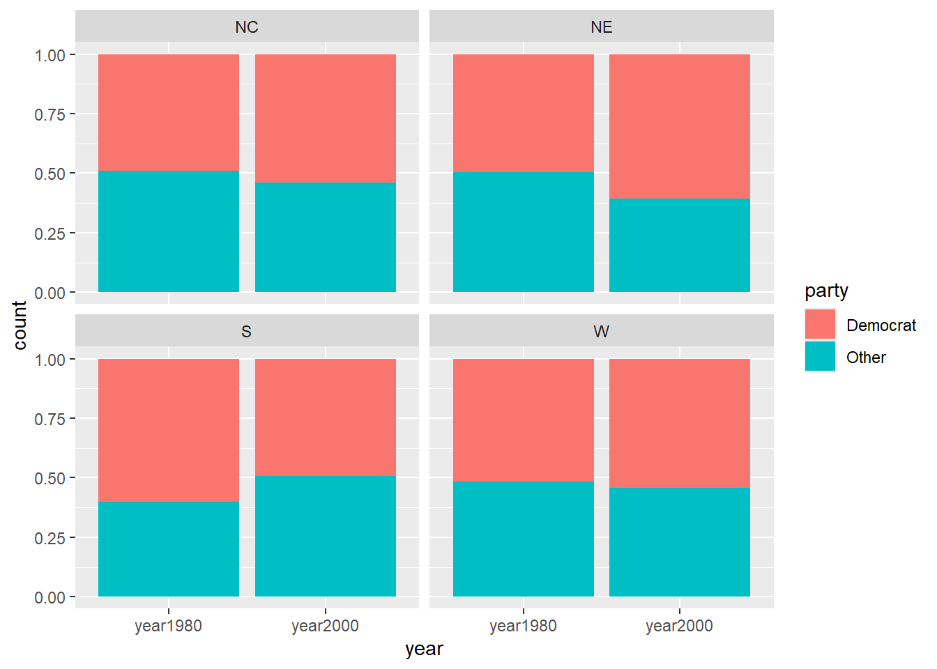 In a quasi-binomial model, the SE’s will be larger than the binomial model SE’s by a factor of \(\sqrt{1.323} = 1.150\), or about 15% larger. For example, the quasi-binomial SE for the interaction term will be \[ SE_{quasi} = \sqrt{1.323} \times 0.008085 \approx 0.0092995 \]