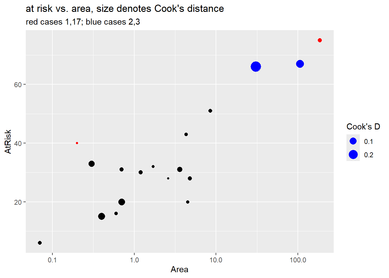 - Case 3 (Ristikari) has the third largest area (30.7) but it’s number at risk (66) is only one smaller than case 2 (Maakrunni) which is the second largest area (106). Case 3 also has a much larger residual than case 2, which results in it having the highest Cook’s distance value in the data set.