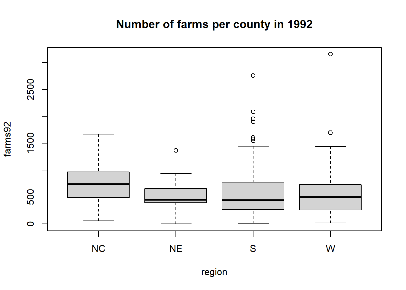 We can also use the ggplot2 package to get side-by-side boxplots grouped by a third variable. Here we can compare the distribution of total farm acreage in 1992 (acres92) by region for counties that have fewer than 500 farms vs. 500 or more farms: